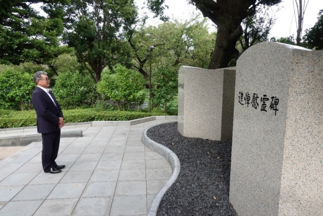 戦後強制抑留・引揚死没者慰霊碑の前で