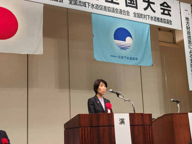 令和7年11月6日、堀内総務副大臣は、「下水道事業促進全国大会」に出席し、下水道事業促進に関する提言書を受け取り、来賓挨拶を行いました。挨拶では、各地方団体が運営している下水道事業の経営強化に向けて総務省が実施している取組を紹介するとともに、下水道事業への地方財政措置の充実に向けて決意を述べました。