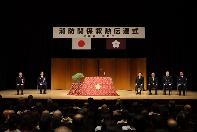 危険業務従事者叙勲の受章者は、永年にわたり、消防活動のため昼夜を分かたず献身的に御尽力され、地域住民の安全の確保に顕著な功績をあげてこられた方々です。伝達式には、559名の受章者及び配偶者が出席され、林総務大臣が式辞を述べた後、勲記・勲章の伝達を行い、中野総務大臣政務官がお祝いの言葉を述べました。