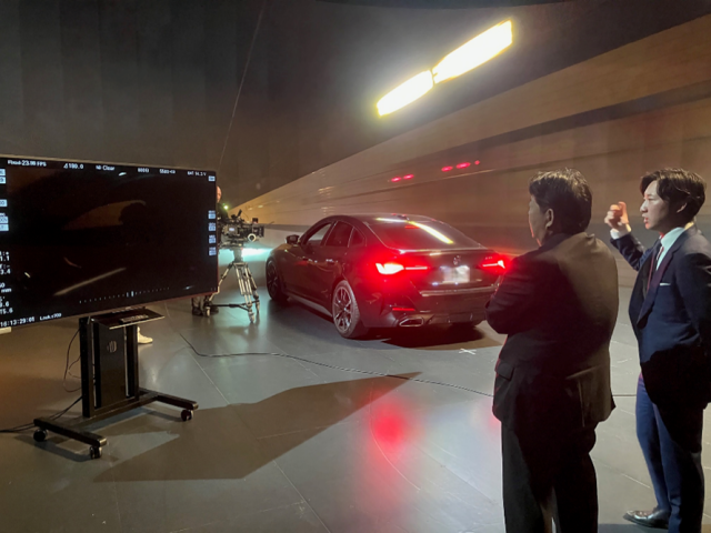 VPスタジオで自動車走行シーンの撮影手法の説明を受ける様子