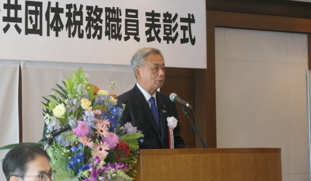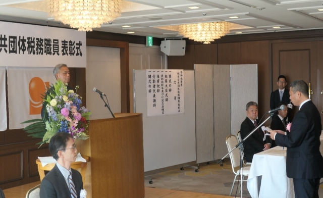 高橋総務副大臣は、式辞を述べるとともに、地方公共団体税務職員として20年以上勤務し、その成績が優秀で、他の一般職員の模範として都道府県知事・市町村長から推薦のあった方々に対し、表彰状と記念品を授与しました。