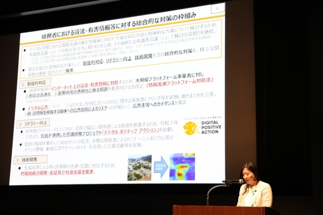 向山総務大臣政務官は、インターネット上の偽・誤情報の流通・拡散等に関する課題が大きくなっている現状を踏まえ、総務省における偽・誤情報への総合的な対策や、ICTリテラシー向上の必要性、「DIGITAL POSITIVE ACTION」の取組の意義などを紹介しました。