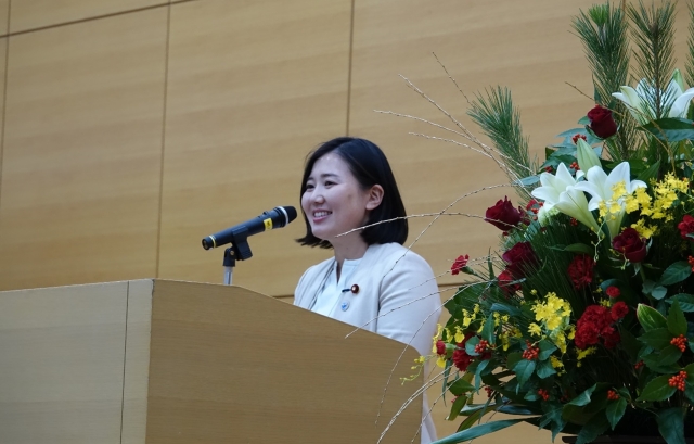 賀詞交歓会にて挨拶する向山総務大臣政務官