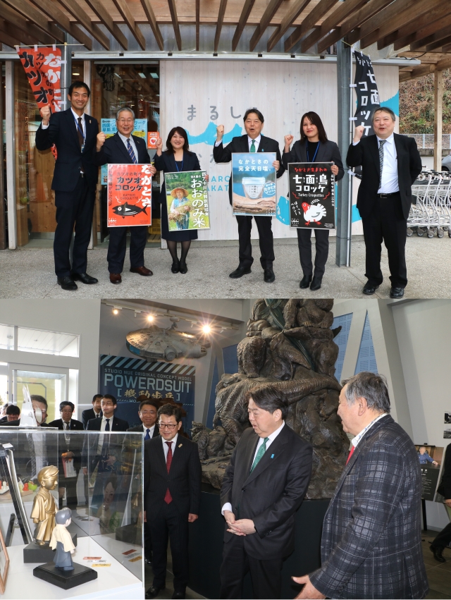 (下)「海洋堂SpaceFactoryなんこく」を視察する林総務大臣