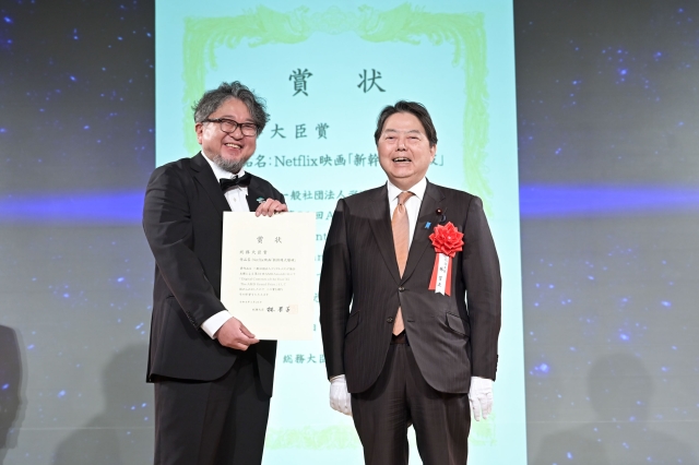 来賓挨拶において、総務大臣賞受賞作品である「新幹線大爆破」がいかに素晴らしいかや、その制作に携わった方々への激励の言葉を述べるとともに、同作品の監督・樋口真嗣氏と出演者・斎藤工氏に対して総務大臣賞を授与しました。