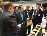 可視光(LED)通信機器の説明を受ける西銘総務副大臣