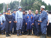 福岡県朝倉市杷木星丸地区で災害現場の説明を受ける安倍総理大臣(前列左側から2番目)と高市総務大臣(前列左端)