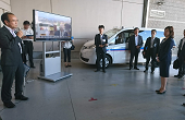 VoiceTraを使用しながら挨拶する野田総務大臣