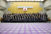受章者代表から謝辞を受ける石田総務大臣(写真上)お祝いの言葉を述べる鈴木総務副大臣(写真左下 左から4番目)お祝いの言葉を述べる古賀総務大臣政務官(写真右下 左から3番目)