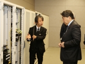 人材育成に対応したバーチャルトレーニングシステムを実際に体験する古川総務大臣政務官