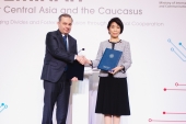 受章者代表に勲記と勲章を伝達する梶原総務大臣政務官
