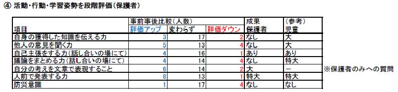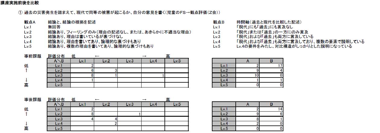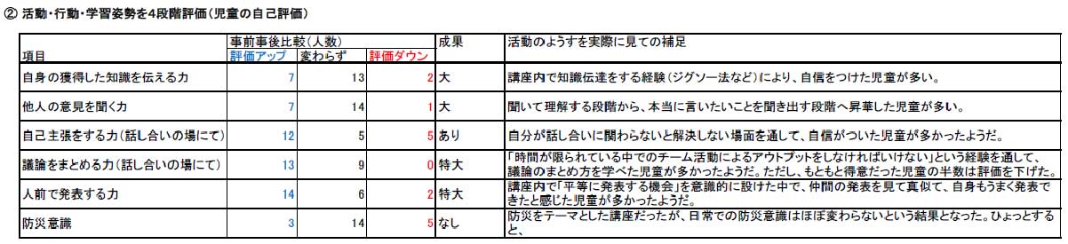 | 成果 | 地域における防災課題を意識することができるようになった。最終日に「地域の防災」を考えさせた際の知識のベースになった。 | |