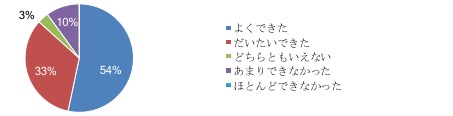 ●「よくできた」と「だいたできた」の合計が73%、一方「あまりできなかった」が17%となっている。実証講座に入る段階では、ほとんどの児童はプログラミング体験が初めてだったことから、自主的に作業を進めることが困難でありメンターの指示に従って進めざるをえないレベルであったことがその要因と考察される。今後、プログラミングの体験を増やしていくことにより自主的に取り組めるようになってくるのではないか。