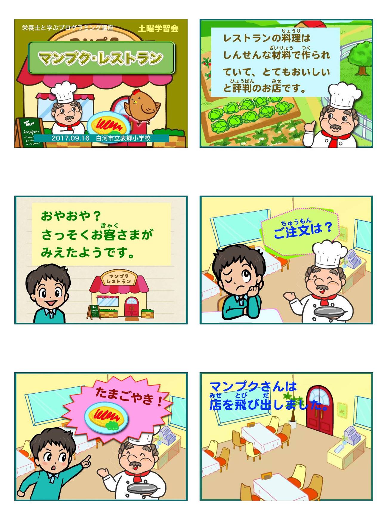 授業者用プレゼンは、スクール・プレゼンテーションの手法を使用して、身近な料理(卵焼き)をテーマにした物語「マンプク・レストラン」によって、子どもたちの学びにコンテキストを与え、同時にモチベーション・アップにつながるプログラミング教育の教材として開発されている。このため、小学校におけるプログラミング教育の入門コースとして適している。