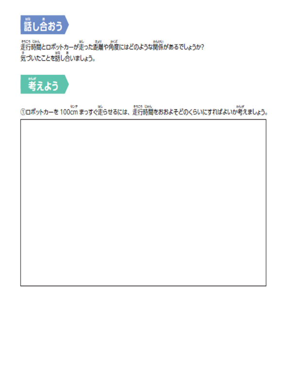 - 算数科で学習した内容(角度や比例の概念)を活用する場面を設定したテキスト内容にしている。