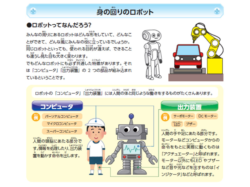 - プログラミングだけでなく、身の回りのロボットの仕組みも学べるテキスト内容にしている。