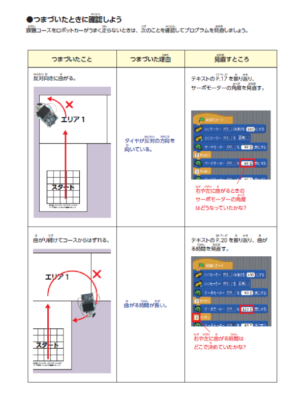 小学生用テキストは実証事業を踏まえて修正を加えた。本実証事業においてはメンターの数が多かったこともあり、メンター1名で子ども2名を見ることができたが、実際の学校現場で授業を行う場合は、指導者1名で30名前後を見ることも考えられる。そのため、子どもがどこで失敗したか、なぜ失敗したのかを自ら振り返ることができるように生徒用チェックシートを新たに用意した。