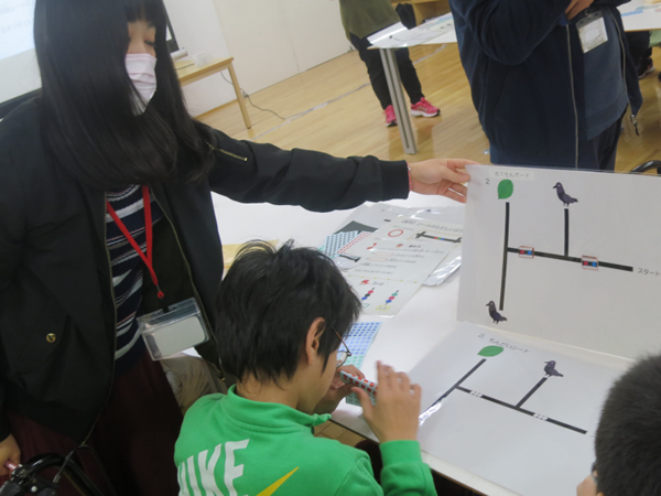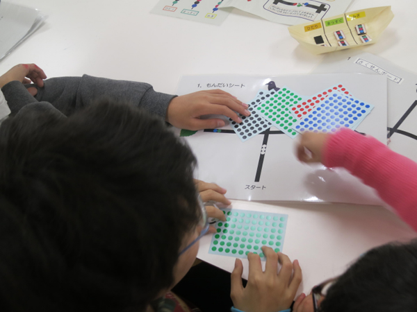 担当の児童がミニ博士になって、通常級2年生のお友達にOzobotの動かし方、Ozobotのチャレンジ問題のやり方を教え、通常級のお友達がチャレンジ問題に取り組んだ。各グループのミニ博士は、Ozobotが上手く迷路を通り抜け、ゴールへ達成したかの判定をする。上手くゴールにたどりつけたら、ご褒美のスタンプをあげた。単純なものから複雑な問題へと課題レベルをあげ、報償としてのスタンプ集めが、グループの課題達成の動機づけとなった。