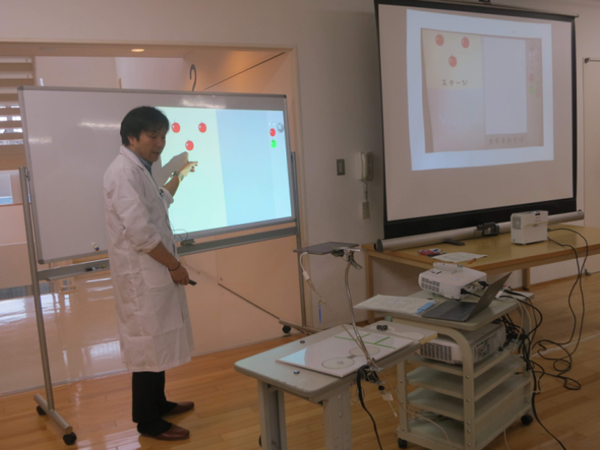 担当の児童がミニ博士になって、通常級2年生のお友達にViscuitでのプログラミングを指導。まずはお絵かき。次にメガネを使ってどう動かすかをパワーポイントでじょうずに説明。説明後は、各グールでお絵かきと、書いたものを動かすプログラミングに挑戦。最終課題は、グループで楽しい動きのある作品を作ること。グループごとにミニ博士が、親切に教えてあげていた。