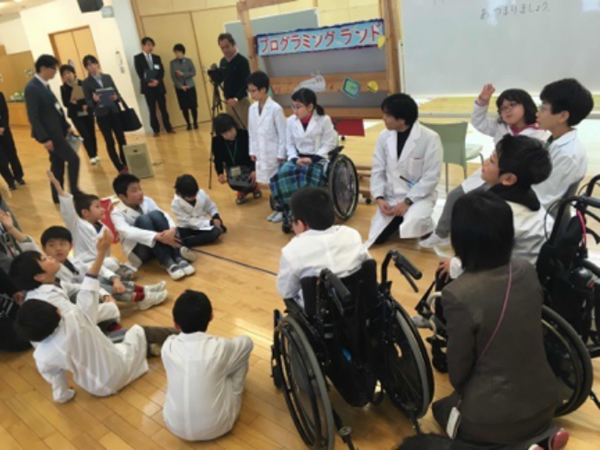 本実証研究では、児童が博士にプログラミングをいろいろ教えてもらうという状況で学習が進められた。最後の活動では、それらを学習した児童が、今度はミニ博士となって通常級の友だちに教えるという状況を設定した。「Teaching is best learning」と言われるが、ミニ博士となって友だちに教えるという状況設定で、指導者としての児童は、より学習内容をしっかり理解しようとする姿が見られると同時に、通常級の友だちに教えるという活動が自己有用感をもたせる結果につながった。
