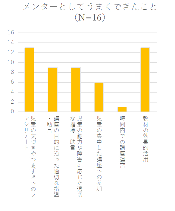 参加したメンターからは、本事業に参加して、プログラミング教育に関する教材やその指導法に関して勉強する機会を得て大変いい勉強になったとの意見が多く聞かれた。本事業では、将来教員になる勉強をしている学生と社会人との両方でメンター育成を行ったが、学生メンターにあっては、児童理解、特に障害ある児童への対応に関する講義を大学で受講していることもあって、授業時の児童への対応や児童の行動を考えた教材づくりなどが大変上手にできた。