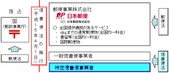 平成15年4月1日に「民間事業者による信書の送達に関する法律(平成14年法律第99号)(以下「信書便法」という。)が施行され、これまで国が独占してきた封書やはがき等の信書の送達事業へ民間が参入できることになりました。