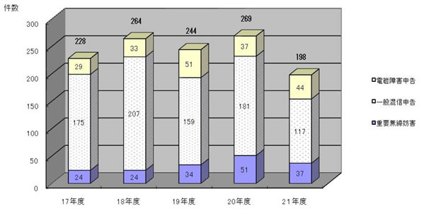 そのうち、重要無線通信妨害(注1)に関する申告は37件、業務用無線やアマチュア無線など一般の無線局への混信等に関する申告は117件、人体への電磁波の影響の相談や家庭電化製品等への障害に関する電磁障害申告は44件となっています。