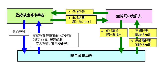 登録検査等事業者制度とは、総務大臣の登録を受けた登録検査等事業者が、無線設備等の検査(又は点検)を行い、免許人から当該検査(又は点検)の結果を記載した書類の提出があったときは、無線局の定期検査を省略(又は新設検査、変更検査及び定期検査の一部を省略)することができる制度です。