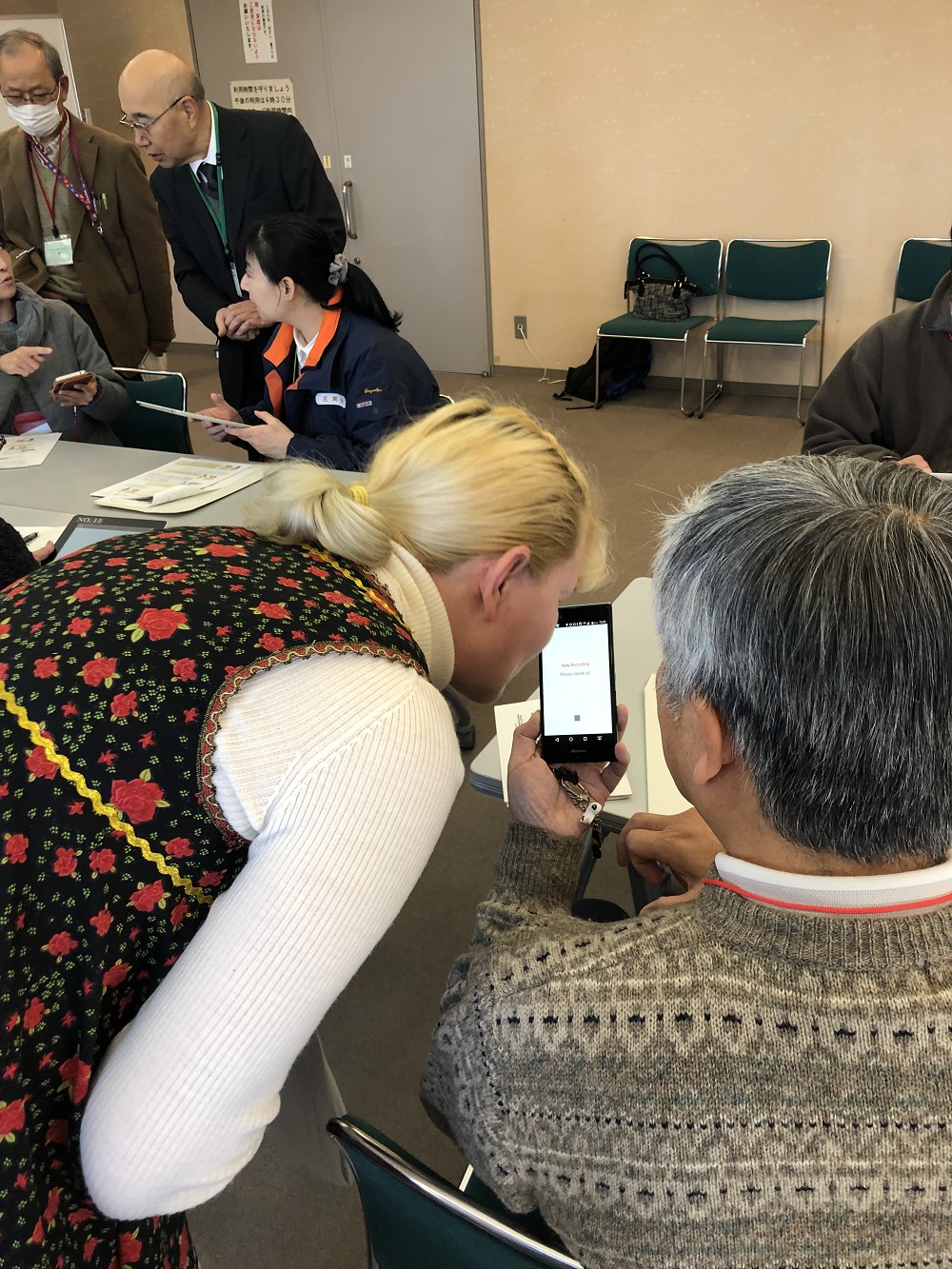 本講座では、自主防災組織、民生委員、周辺自治体の職員及び災害支援を専門的に行うNPOなどが参加する協働型災害訓練におけるワークショップの一つとして、訪日外国人被災者への対応を目的に、多言語音声翻訳アプリ「VoiceTra」の操作方法等の説明及び実習を行いました。