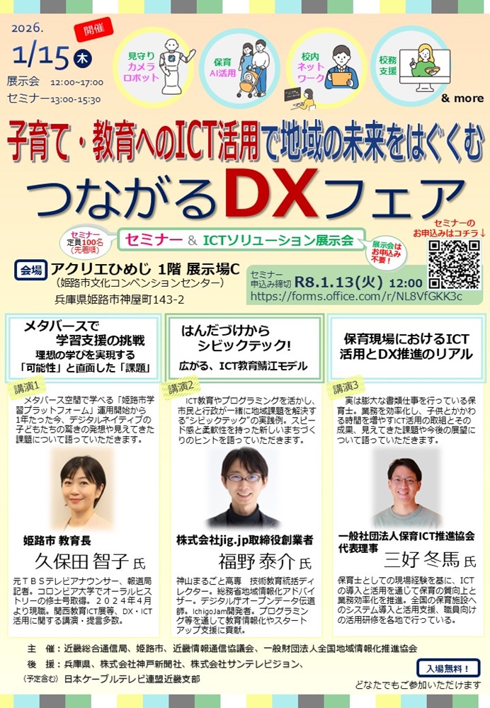 近畿総合通信局(局長:野水 学(のみず がく))は、姫路市、近畿情報通信協議会、一般財団法人全国地域情報化推進協会等と連携し、子育て・教育へのICT活用をテーマとした「つながるDXフェア」を兵庫県姫路市において開催します。