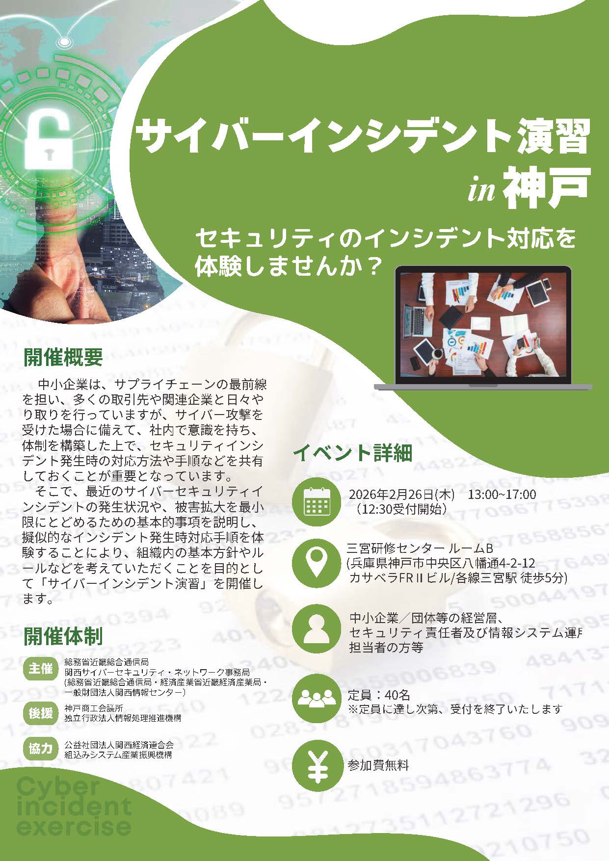 近畿総合通信局(局長:野水 学(のみず がく))は、令和8年2月26日(木)に神戸市内で、中小企業等を対象に、情報セキュリティ上のリスクにつながる状況の疑似体験などを通してサイバー攻撃への効果的な対応法を学ぶ「サイバーインシデント演習in神戸」を開催します。