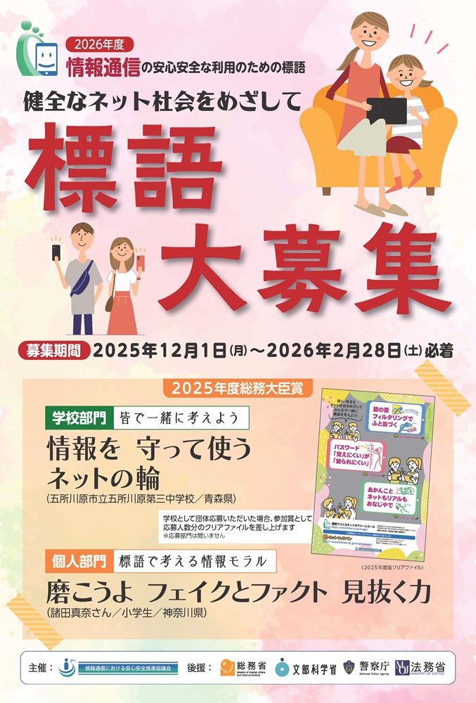 子どもたちの情報モラルや ICT リテラシー向上、児童生徒が学び考えるためのきっかけづくり、更には、情報通信利用者が情報通信を安心・安全に利用するためのルールやマナー、情報セキュリティに関する意識や知識の醸成を図ることを目的に、毎年12月から翌年2月まで標語を公募し、優秀な作品を表彰しています。