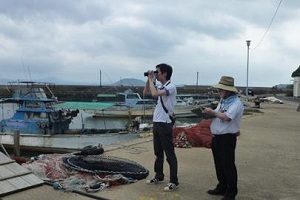 3人1組のチームは、アンテナを設置した小型船舶の船舶番号や船名を双眼鏡で確認、内容を調査票に記録、写真撮影とそれぞれ役割分担して調査を進めていく。
