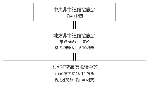 総務省が中心となり、消防庁、内閣府、警察庁、防衛省、国土交通省、気象庁、海上保安庁、日本放送協会、都道府県、市町村その他主要な電気通信事業者及び無線局の免許人等、非常通信に関係の深い者によって構成されています。