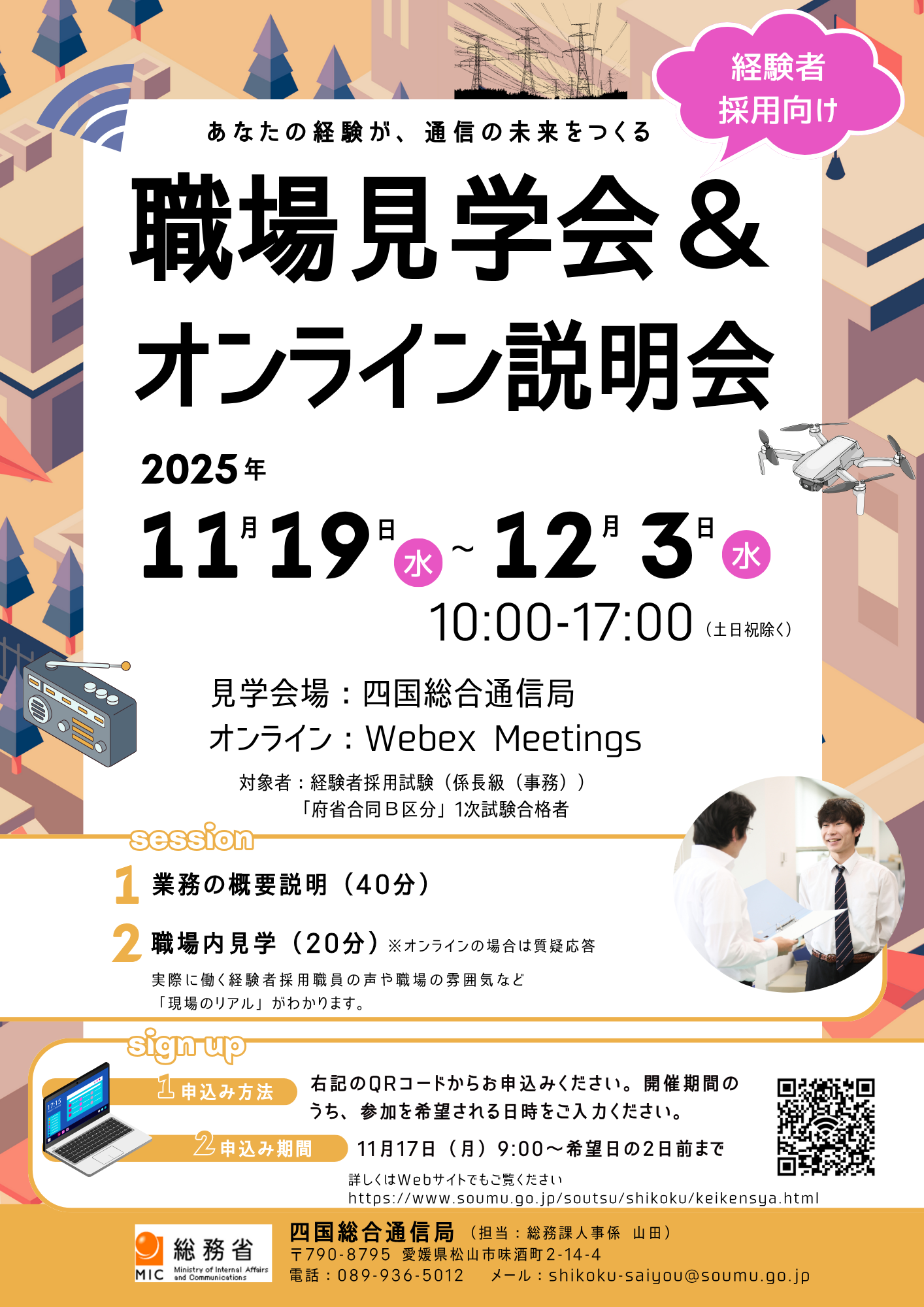 四国総合通信局では、次のとおり職場見学会及びオンラインによる業務説明会を開催します。
