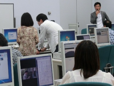 続いて、研修生はビデオカメラごとに二人一組に分かれて映像の企画や構成などを話し合い、ビデオカメラを使って様々なシーンを撮影しました。その後、撮影した映像をパソコンに取り込み、映像のカットや文字の挿入などの編集作業をおこない、完成作品を全員で視聴し講師からアドバイスを受けました。
