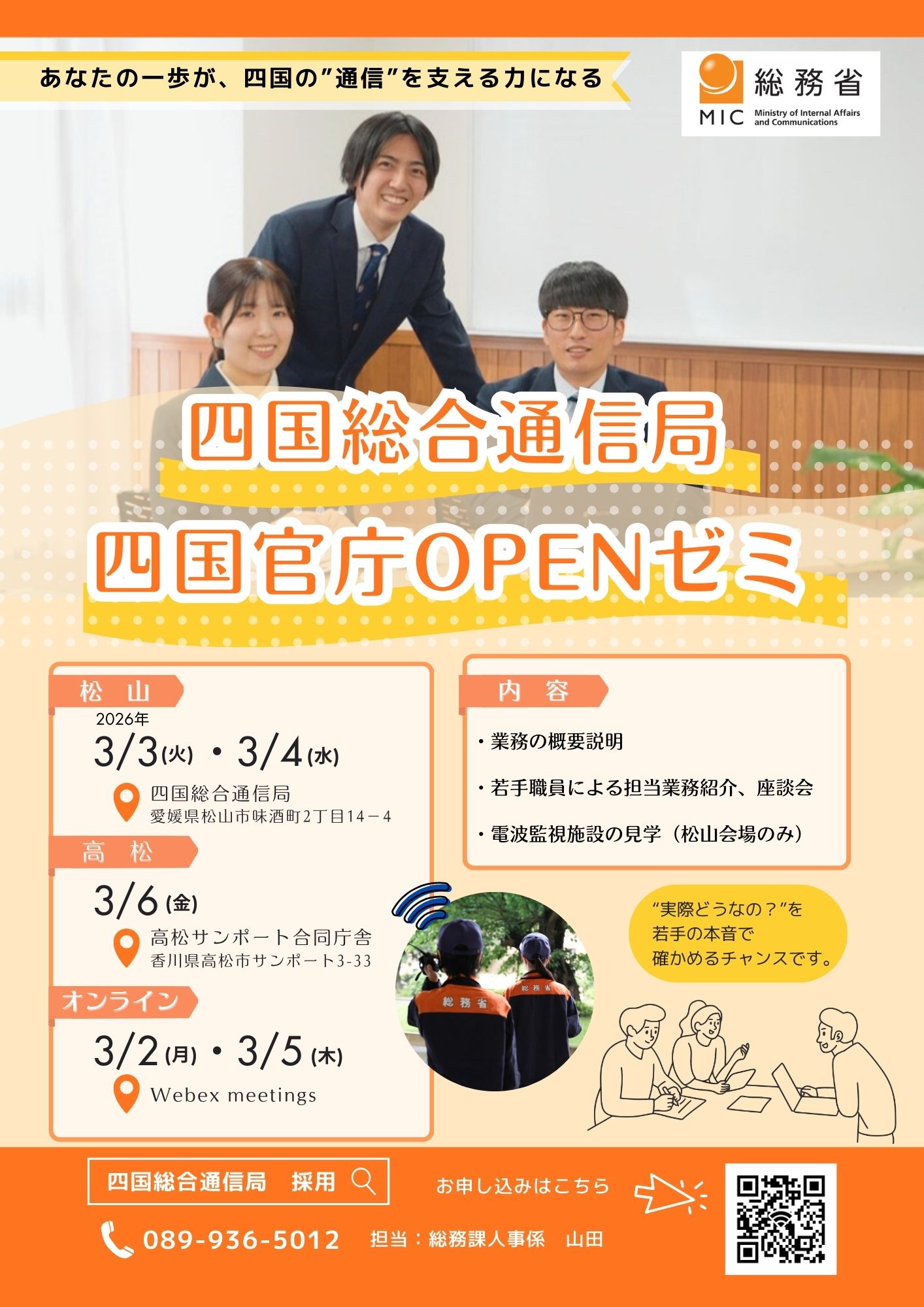 四国地区の官庁が、対面又はオンラインにより、業務説明、職場紹介、若手職員との懇談等を行います!その官庁独自の職場の雰囲気や公務のやりがいを感じとれる絶好の機会です!