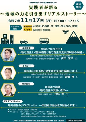 今年度は、「実践者が語る〜地域の力を引き出すリアルストーリー〜」をテーマとして基調講演や事例紹介、パネルディスカッションを行い、会場とオンラインを合わせて、企業や地方公共団体等から約70名にご参加いただきました。