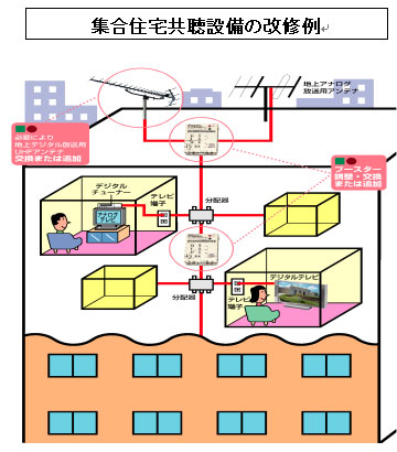 | ビルや集合住宅では、各戸各室にテレビ電波を届けるため、屋上にアンテナを置き、ブースター(増幅器)や分配器等の機器を利用しています。このため、一部のビルや集合住宅では、地上デジタル放送に対応するための機器調整や改修工事が必要な場合があります。 | ![]() |