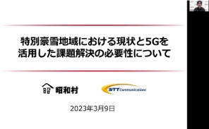 [概要]エヌ・ティ・ティ・コミュニケーションズ株式会社の秋山 太郎氏から、5Gを活用した取組例、積雪地域における除雪に関する課題等と5G技術の活用、青森県及び株式会社サン・コンピュータが青森県青森市で実施した5GによるVR描画を用いた除雪ガイダンスシステムの実証実験について講演いただきました。