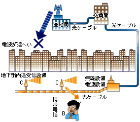 | 高速道路等のトンネル又は地下駅等の閉塞地域といった人口的な建築物により電波が遮へいされる地域においても、携帯電話等が利用できるようにし、電波の適正な利用を確保します。 |