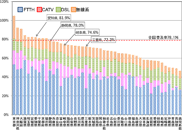 図4:東海管内のブロードバンドサービス別世帯普及率の状況
