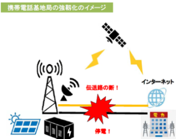 災害時における停電や伝送路断による停波を回避し、携帯電話基地局の機能の維持を図るため、大容量化した蓄電池や発電機、ソーラーパネル及び衛星の活用に係る費用の一部を補助します。