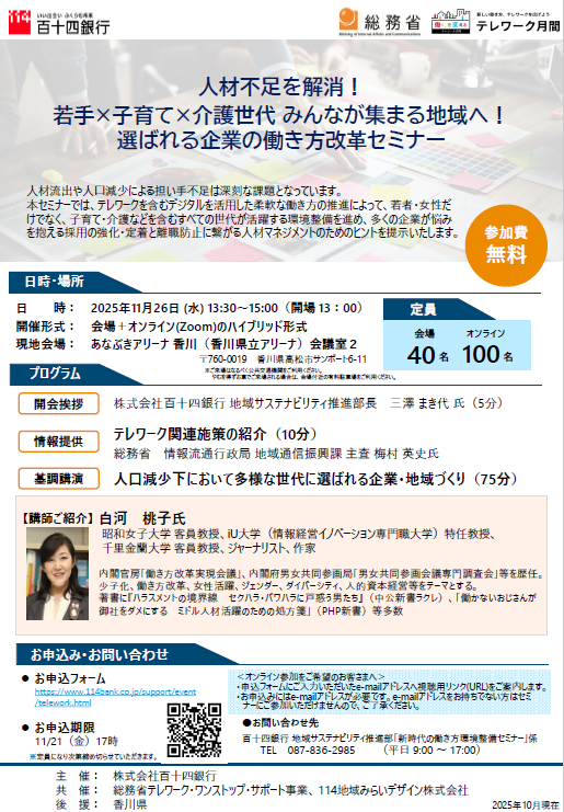 お問い合わせ:百十四銀行 地域サステナビリティ推進部「新時代の働き方環境整備セミナー」係
