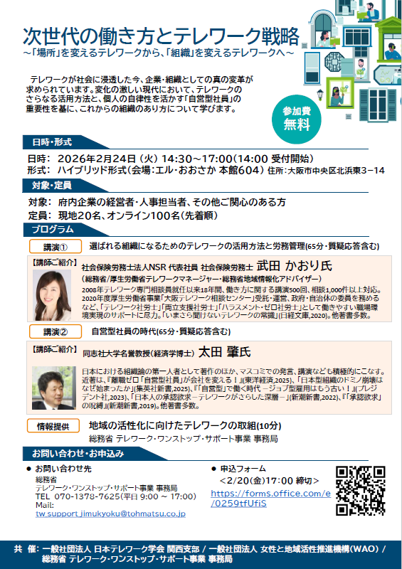 共催: 一般社団法人日本テレワーク学会関西支部 / 一般社団法人女性と地域活性推進機構(WAO) / 総務省テレワーク・ワンストップ・サポート事業事務局