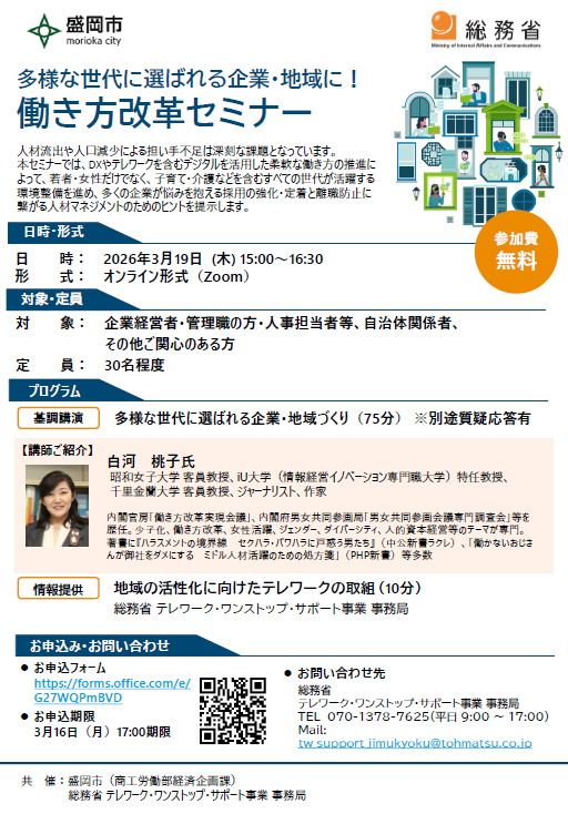 共催:盛岡市(商工労働部経済企画課)、総務省テレワーク・ワンストップ・サポート事業事務局
