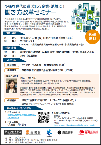 本セミナーでは、テレワークを含むデジタルを活用した柔軟な働き方の推進によって、若者・女性だけでなく、子育て・介護などを含むすべての世代が活躍する環境整備を進め、多くの企業が悩みを抱える採用の強化・定着と離職防止に繋がる人材マネジメントのためのヒントを提示しました。