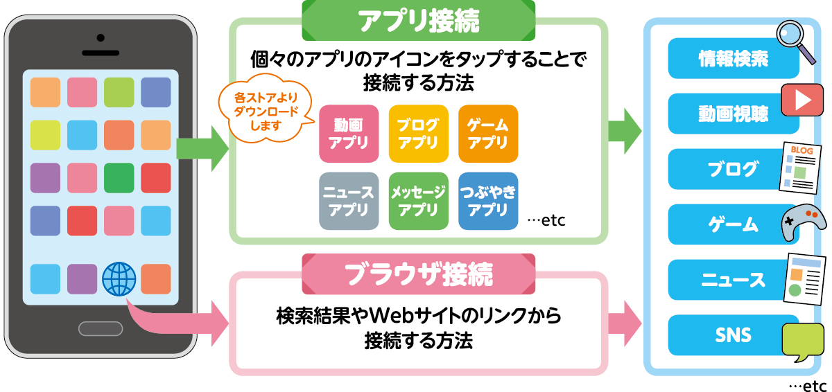 パソコンと同じブラウザ接続の他に、アプリでインターネットに接続する方法もあります。